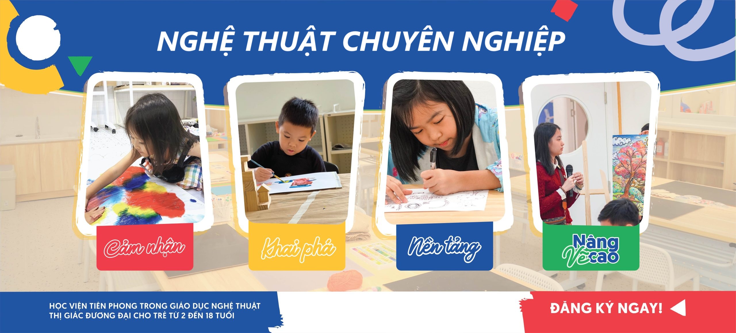nghệ thuật theo định hướng dài hạn, được chia thành các giai đoạn phát triển phù hợp với từng độ tuổi và khả năng của học viên theo lộ trình từ Cảm Nhận, Khai Phá, Nền Tảng và Nâng Cao.